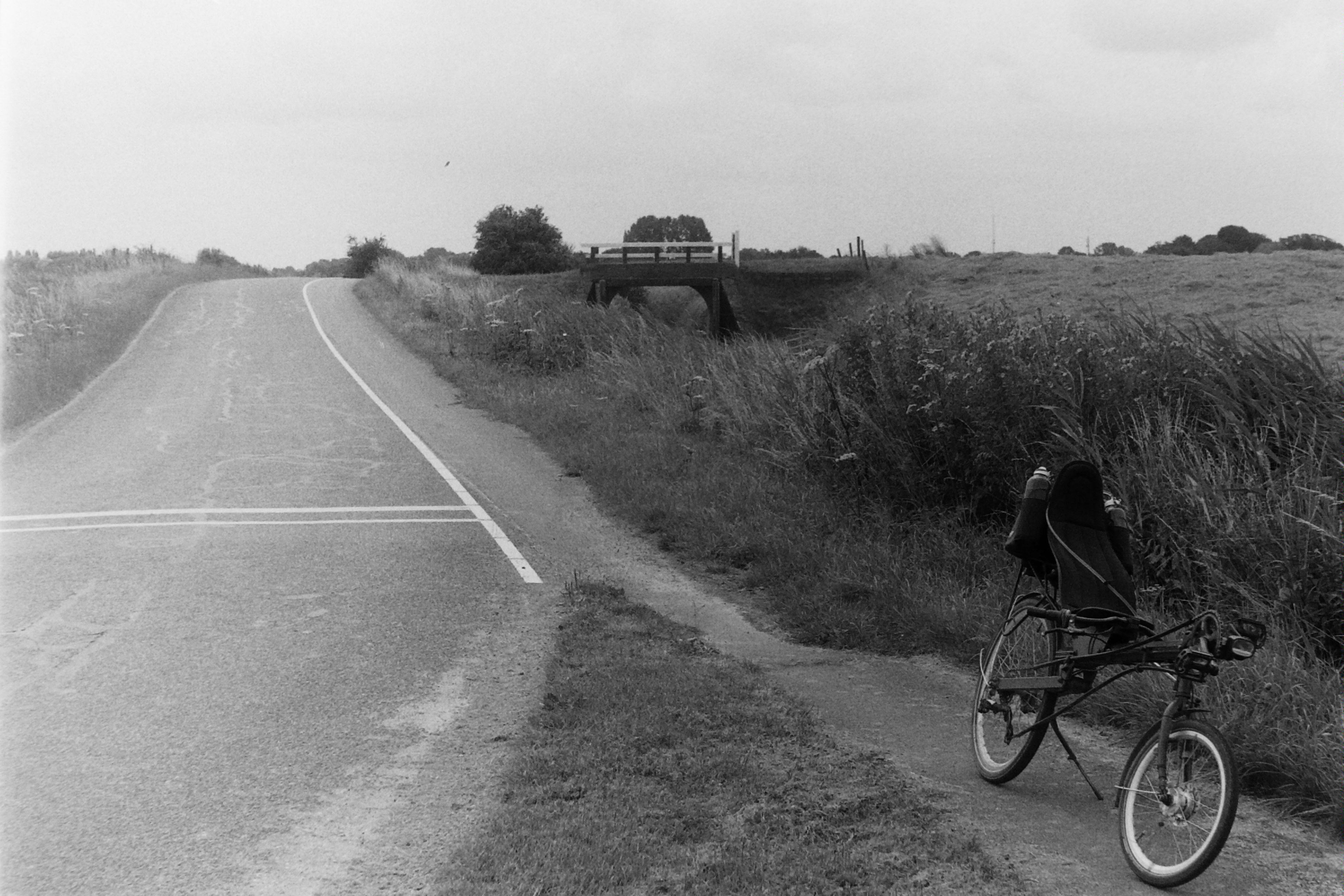 35 mm, analog, dijk, fiets, filmphotography, Ilford FP4 125 ISO, Liegerad, ligfiets, recumbent, recumbent bicycle, sluis, Zenit 3M, Zwart/wit- Albums