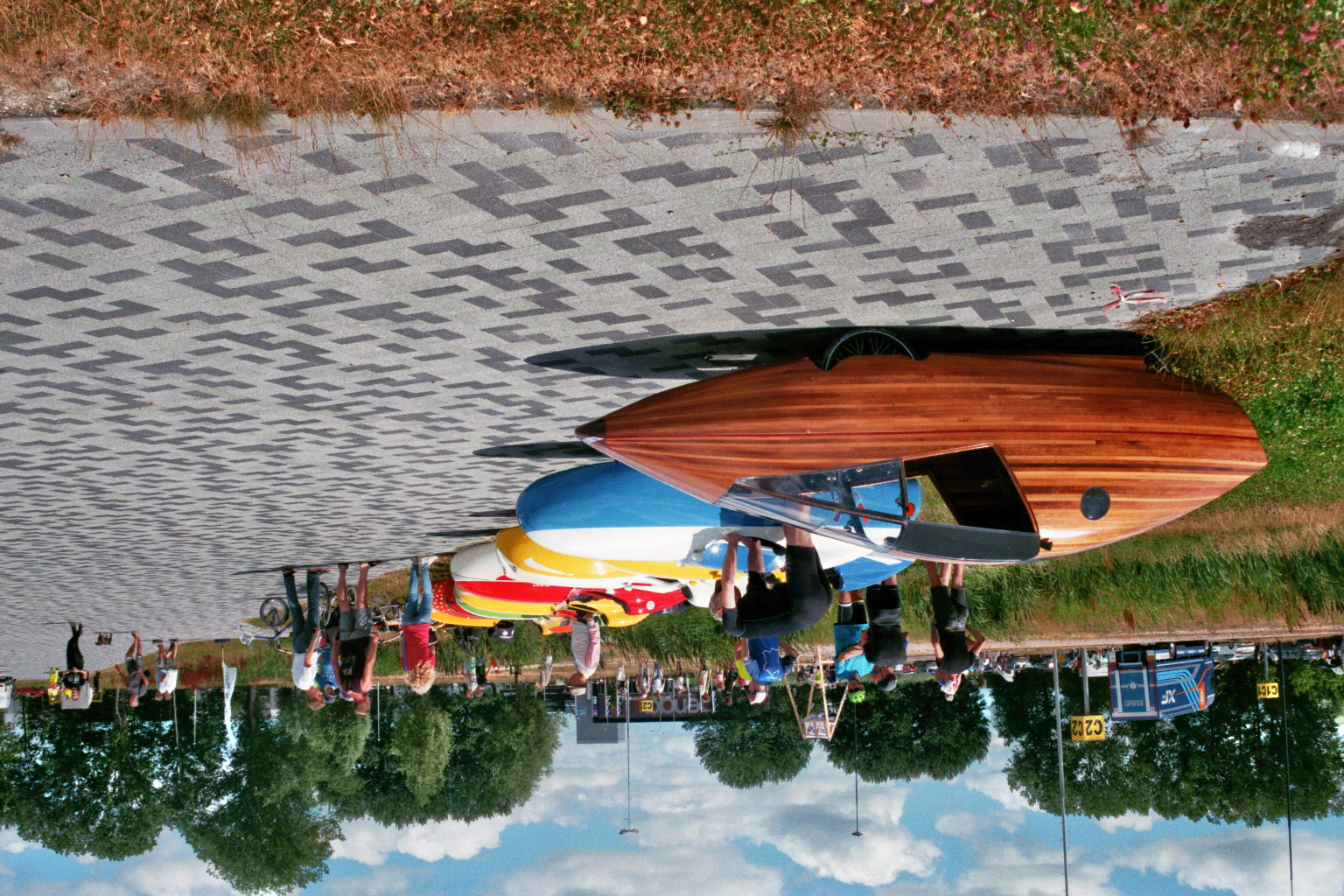 De fossielvrije parade van de Elfwegentocht eindigde bij de Elfstedenhal in Leeuwarden. Daar werden de ligfietsen opgesteld. Deze zelfgebouwde houten tweepersoon velomobiel trok de nodige aandacht.